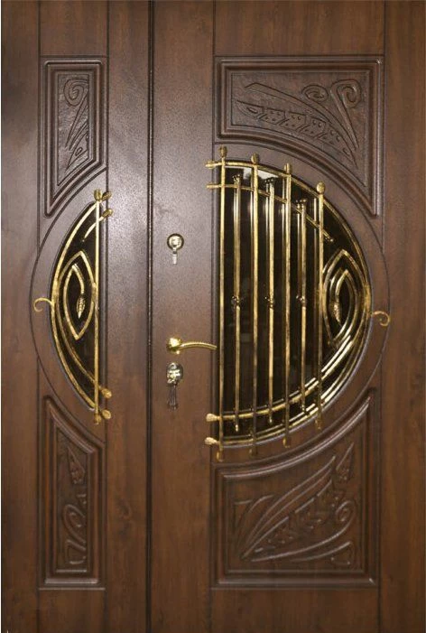 Поскольку в большинстве случаев устанавливаемые на входе в коттедж двустворчатые двери являются еще и предметом интерьера, украшающим здание, их дизайну предается особое значение. Эти двери, как правило, отделываются атмосферостойким МДФ, натуральным шпоном, массивом. Эффектно на таких дверях смотрится витражный узор, применение ковки, зеркальных элементов. Вариантов декора входной двустворчатой двери масса, тут все зависит от пожеланий заказчика.